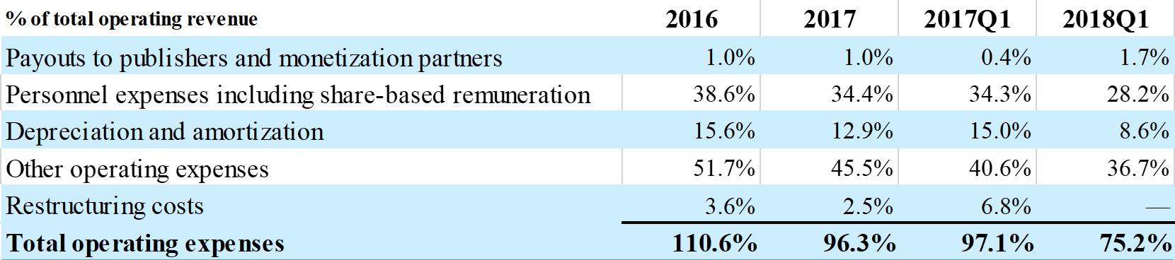 从构成比例来看,2016-2017年营收结构整体变动不大,搜索和广告业务占比略微有所增长。但2018Q1,广告业务占比较去年同期有较大增长,同比增速达79%;搜索业务同比增速为31%。未来随着信息流业务的推进,长期看Opera的广告业务将仍有机会保持高速增长。但是其搜索业务面对搜索巨头,议价能力较弱,除非MAUs继续快速增长,否则该业务空间有限。