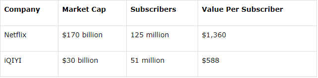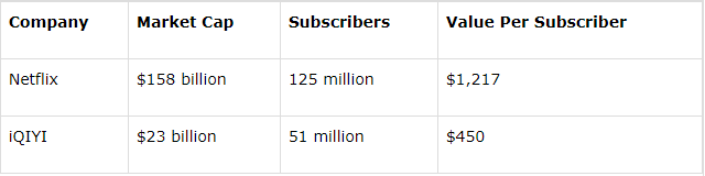 市场上爱奇艺的看多方通常会把爱奇艺跟奈飞做对比,认为两者是相似的,所以也应该有相似的估值。但是,爱奇艺和奈飞有不同的用户对象,一个是在中国,一个是在美国,两方用户有不同的购买力差异,每个用户能够贡献的价值也就不同,只有在调整这方面的差异之后两者才具有可比性。