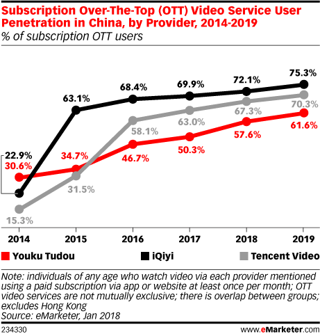 另一方面,从竞争上看,奈飞起步很早,早期的竞争者很少,只是最近才有了迪士尼和福克斯等的竞争,但是在中国,有三家主流的互联网电视平台,且具有很接近的渗透率,如下图所示: