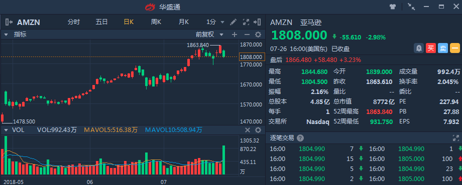 亚马逊在美股市场周四收盘后公布2018财年第二季度财报,净利润和每股摊博收益均超预期,盘后股价大涨3%以上,报1866.480美元,触及历史新高。