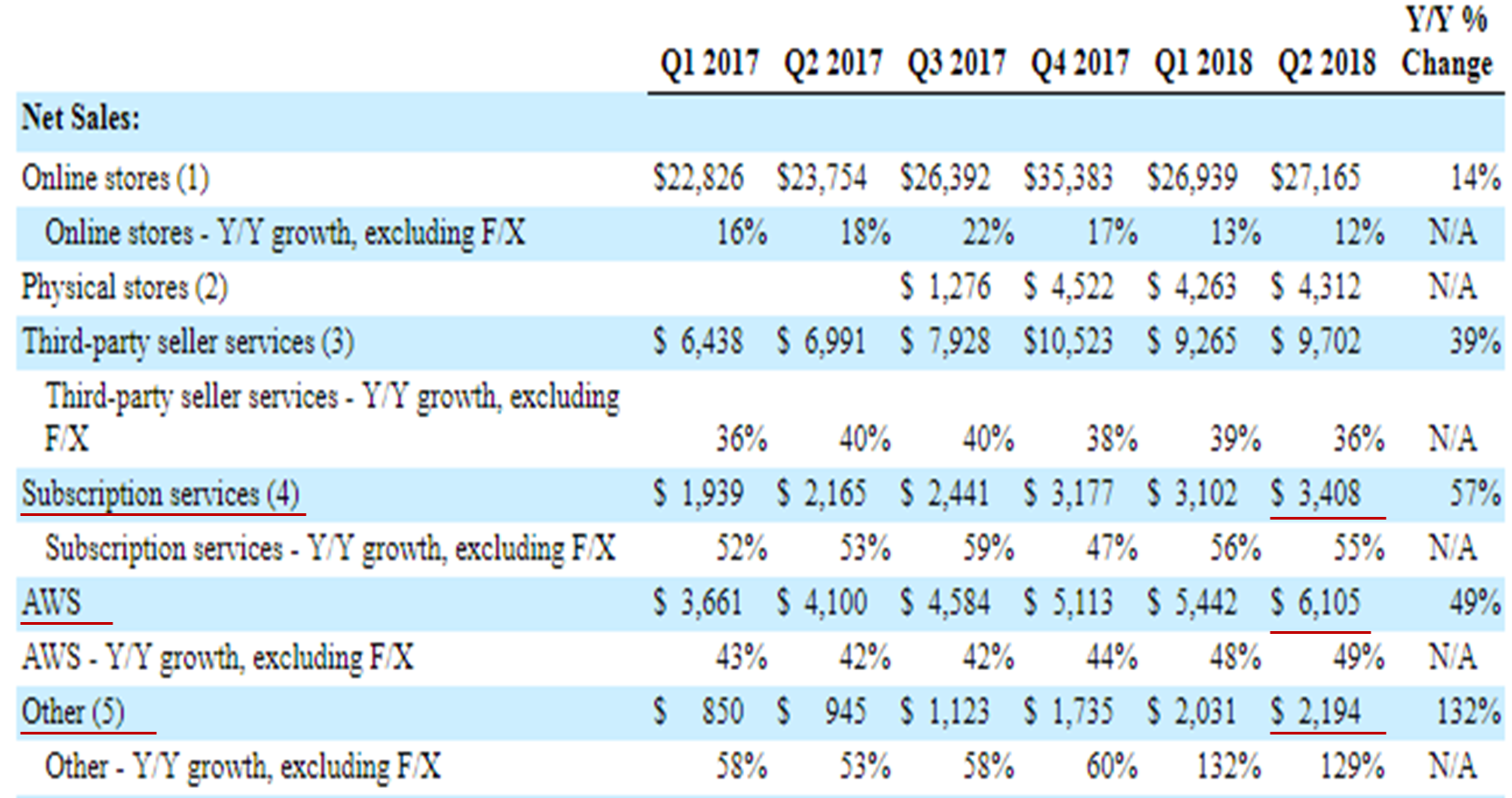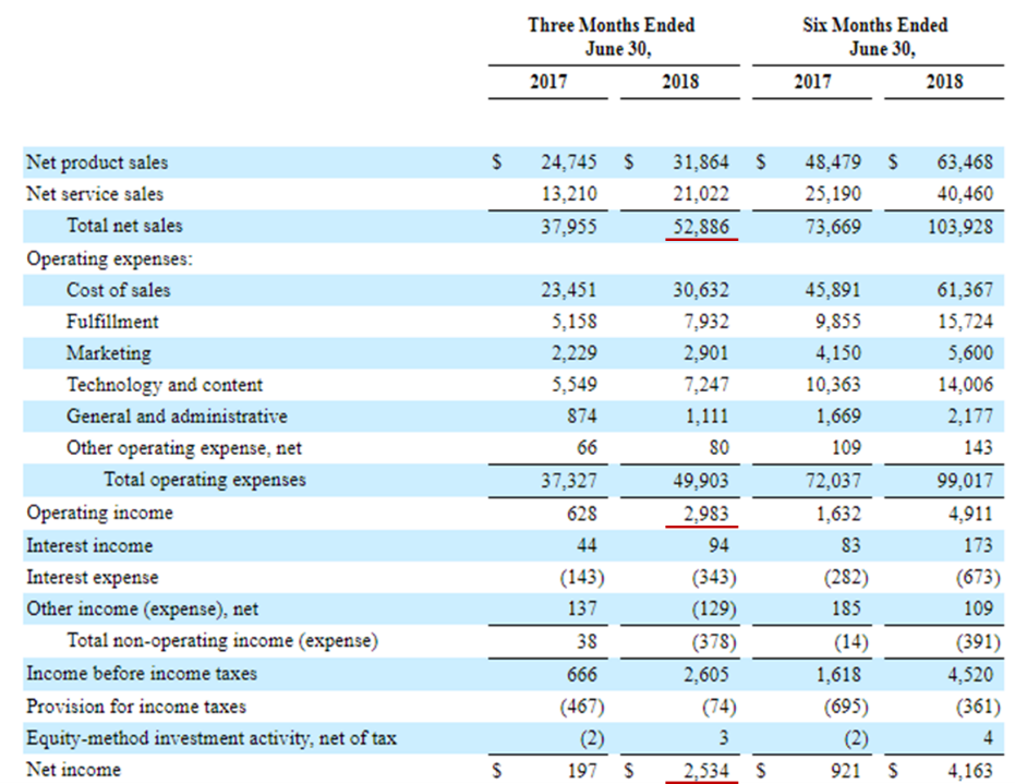 亚马逊二季度的订阅服务收入为34.1亿美元,不计入汇率变动的影响同比增长55%,且2017年至今各季度平均增长率在50%以上,保持较高的增速。订阅服务这一块主要包括亚马逊Prime会员服务、有声读物、电子书、视频、音乐等非云服务的订阅服务,其中亚马逊也开始布局流媒体领域,与流媒体巨头奈飞竞争,争夺流媒体市场的巨大蛋糕,亚马逊在原有的视频数据和用户基础上有希望抢占一部分的蛋糕,贡献整体业务的利润增长。