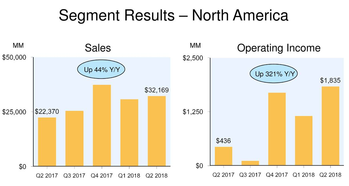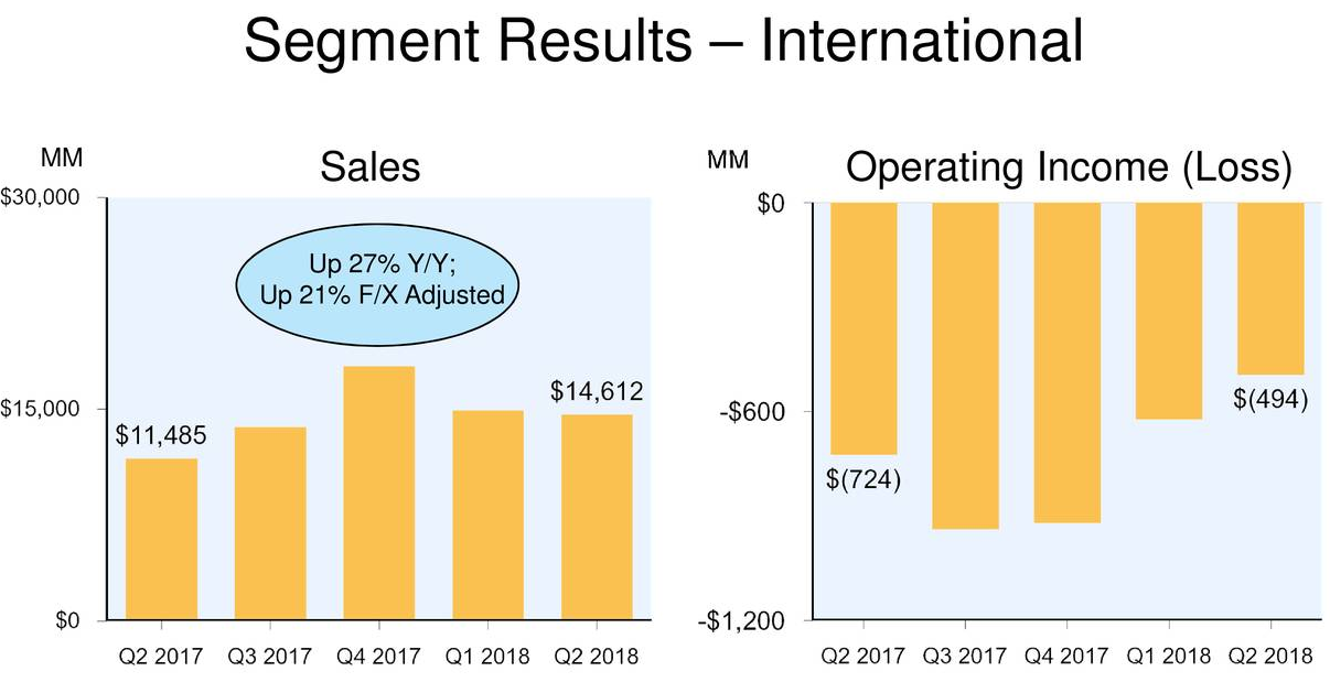 从不同区域来看,北美地区销售收入为321.7亿美元,同比增长44%,而营业收入为18.4亿美元,同比大幅增长321%;而相比之下,国际业务上销售收入仅为146.1亿美元,不计入汇率变动的影响仅为同比增长21%,而营业损失虽然有所收窄,但是仍为-4.9亿美元。