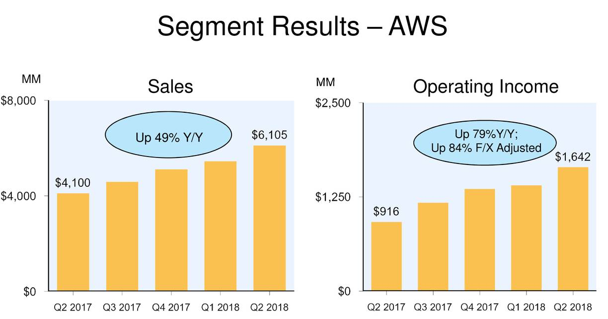 相比之下,亚马逊不断加重注的AWS云服务不负所望,销售收入同比增长49%达61.1亿美元,而营业收入达16.4亿美元,不计入汇率变动的影响同比大增84%,占总营业收入达55.0%,贡献了多数的利润。根据市场研究机构Canalys数据,亚马逊在云服务领域依然占据主导地位,2018年第一季度亚马逊云服务市场份额为31.7%,微软为16%,谷歌为7.4%,二季度以来各方巨头在云业务上也都在奋起直追,微软Azure云现在是已是微软的最大增长动力点,连续两季度增速都在90%左右,而谷歌最新Q2财务数据显示,包括云业务在内的其它营收,同比增长36.5%,未来云服务领域将会是巨大的竞争点,同时也是丰厚的盈利点。