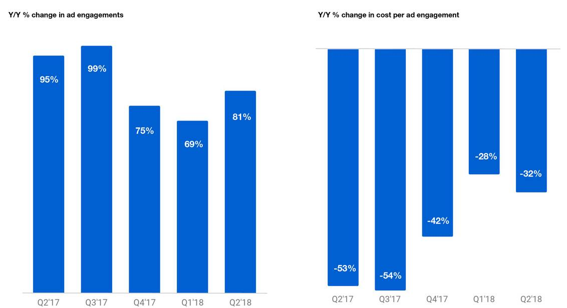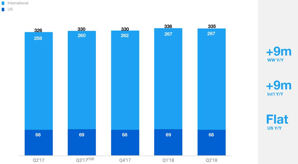 作为社交平台的最核心指标,公司Q2月活远不及预期,盘前大跌16%;季度平台月活(MAU)为3.35亿,低于市场预期3.39亿,同时也低于上一季度的3.36亿,是公司自17年Q2以来出现的首次下滑。按地区分布,美国地区月活同比持平,均为6800万,但相比上一季度的6900万有所下滑;国际地区Q2月活为2.67亿,比去年同期高900万,环比增加500万。