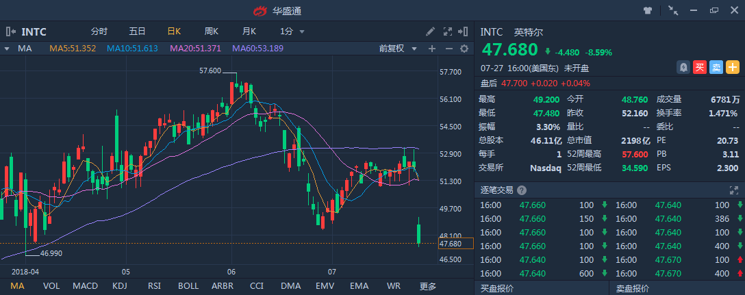 美东时间7月26日盘后,芯片巨头英特尔发布2018财年Q2财报,虽然营收和EPS均超出预期,但由于数据中心部门(DCG)营收不及预期,以及10nm芯片上市时间延后,导致公司股价在27日大跌至47.68美元,跌幅8.59%。
