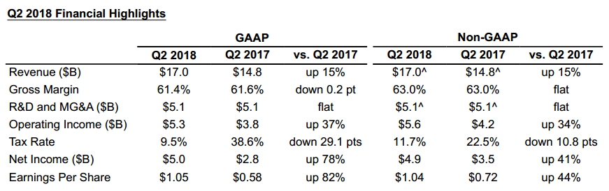 公司Q2营收170亿美元,同比增长15%,比预期高1.8亿美元;毛利率为61.4%,与去年同期持平;研发和收购支出为51亿美元,与去年同期持平;营业利润53亿美元,同比增长37%;净利润50亿美元,同比增长78%;NON-GAAP标准下的摊薄EPS为1.04美元,比预期高0.07美元。具体见下图: