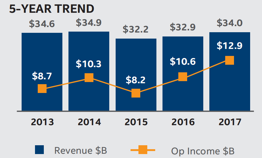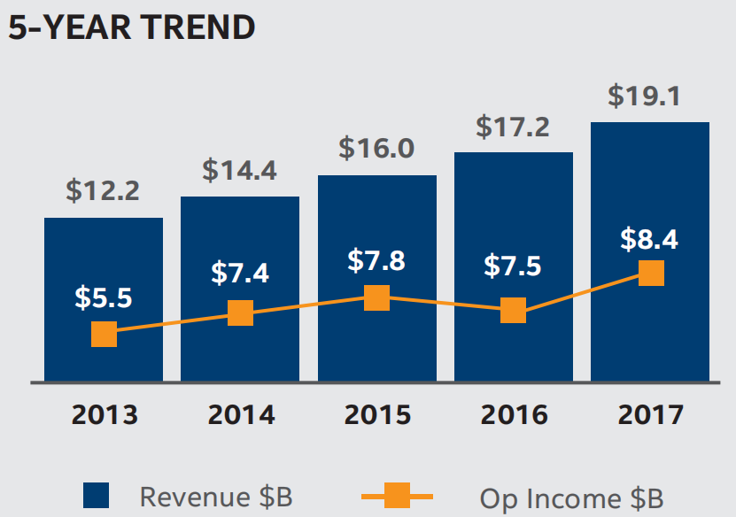 CCG业务的增长缓慢让英特尔更依赖数据处理中心(DCG)业务,该业务相对CCG业务利润率更高,最近几年分部营收占总营收比例约为30%,但为公司贡献40%左右的营业利润,营收在5年内一路上涨,见下图: