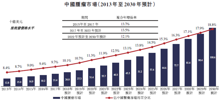 中国抗肿瘤药物市场近年增长快速,从2013-2017年,市场年复合增长率达13.7%,预计2030年市场将达到1006亿美元。