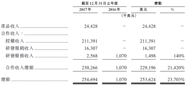 公司虽然没有上市产品,但是截止2017年底,公司90%的收入来自因与新基合作而获得的前期许可费、补偿研发费用和里程碑付款,9.6%来自中国产品分销,成功找到目前最优收入模式。