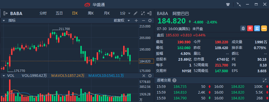 本周美股继续下跌,科技股领跌,周一阿里巴巴下跌2.43%,收于184.82美元。