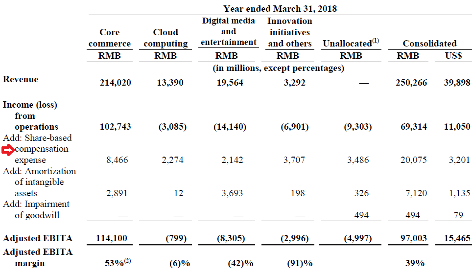 由于中国法律的特殊性,阿里巴巴有非常复杂的股权结构。在这个基础上,如果股权激励占据了利润的相当一部分,那么对投资者将会有很大的影响。大多数分析师是通过阿里巴巴营收增长或是EBITA增长来分析它的增长情况和未来潜力的,但是却应该同样认识到,EBITA数据里包含着股权激励这一个相当大的数目。正如下图所示,2018财年,营业利润是6931.4万人民币,而股权激励是2007.5万人民币,占营业利润的29%,EBITA的21以及总营收的8%。
