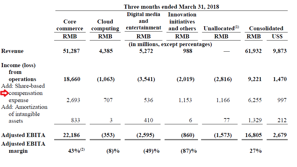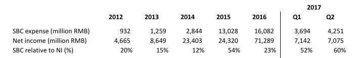 2018年一季度增长更加明显,如下图所示,股权激励是622.5万人民币,而营业利润是922.1万人民币,股权激励占比68%,超过了三分之二。同时又是EBITA的37%和总营收的10%。尽管本季度的EBITA利润率仅为27%,有所下降,但是股权激励却增长了。而且,据管理层说明,未来由于投资项目的增加,利润率有可能会更多地被侵蚀。而且,这些投资项目通常不会像阿里巴巴的核心项目那样带来高利润。那么,如果未来利润率持续下降而股权激励持续增长,可能会导致股权激励超过营业收入,或者超过EBITA的一半。