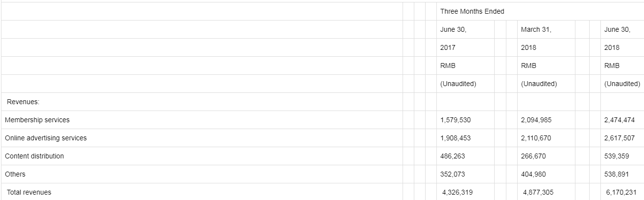 财报表明,本季度总营收为62亿人民币,同比增长51%。其中在线广告服务营收26亿元,同比增长45%。会员服务收入25亿元,同比增长66%。内容分销收入为5.39亿元,同比增长18%。