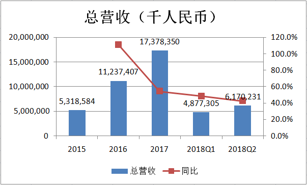 爱奇艺于美国周二收盘后公布了2018年二季度财报。根据财报,二季度爱奇艺总营收61.7亿元人民币,同比增长51%。毛利率为1%,连续三个季度为正。经营亏损13.3亿人民币而去年同期为9.9亿人民币,经营亏损率21.5%。二季度净亏损为21亿人民币,净亏损率为34.1%。总体来看营收增长好于市场预期,而净亏损幅度也高于市场预期。需要注意的是由于自18年起爱奇艺修采用了新的收入会计准则,待重新确认后实际收入的同比增长率会较下列图示中高,现在实际以公司公布的为准。