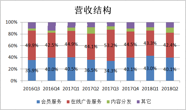 具体营收结构上角度来看,会员服务和在线广告服务仍然是公司最主要的两大营收来源。但是从比率上来说两者都按季有所收窄,其中会员服务比率由43%缩减至40.1%,在线广告服务收入比率由43.3%缩减至42.4%,主要的原因是来自于内容分发业务的环比提升。会员服务和在线广告业务目前合计占公司营收的82.5%。