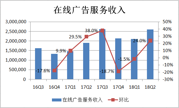而在在线广告服务收入方面,经历了连续两个季度的下跌之后,营收恢复正增长。二季度收入26.2亿元人民币同比增长45%环比增长24%,是营收占比最大的部门。如果参照17年的趋势,广告业务有望在三季度持续保持增长并创造季度新高。