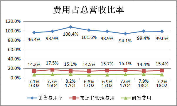 除了在线视频本身以外,类似于抖音、虎牙、B站这样的热门应用也在抢夺用户时间并寻求变现途径,这导致的其中一个结果是,爱奇艺的市场和管理费用以及研发费用占总营收的比例也未见明显减少。因此各费用结合起来,尽管爱奇艺的营收保持着高速增长,但是最终经营亏损率维持在21.5%的水平,而公司的净亏损甚至在扩大,二季度的净亏损率达到了34.1%,高于去年同期的22%。