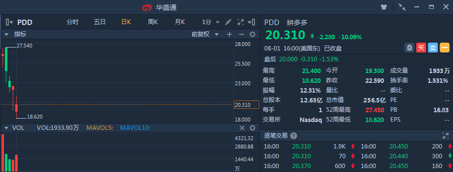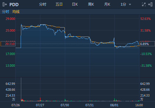 因被工商局约谈,拼多多股价周三大跌10.09%,盘中一度跌破19美元的发行价,收于20.31美元。