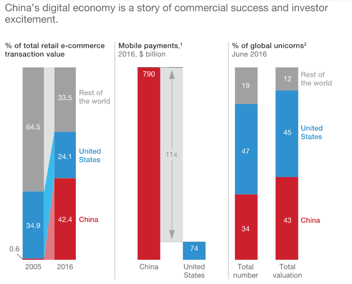 中国的零售行业增长非常强劲,预计2020年将达到48万亿人民币,而网上零售占比将达到22%。而电子商务的增长更为迅猛,据世界经济论坛的2016年数据,中国占据世界电商市场的42%,而美国仅占24%。而在2005年,中国的占比还不到1%,如下图所示。