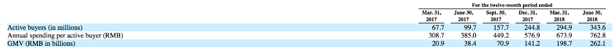 拼多多营收从2016年的5.049亿人民币到2017年的17.4亿人民币,增长245%。而在此期间,其在线市场规模增长了35倍。2017年一季度的活跃用户为6770万,人均消费309人民币,月活数为1500万,而2018年一季度活跃用户达到2.949亿,人均消费额达到674人民币,平均月活数达到1.662亿。而GMV同期从209亿人民币增长到1987亿人民币。而同期,阿里巴巴的活跃用户从4.52亿增长到5.15亿,月活数从5.07亿增长到5.8亿。