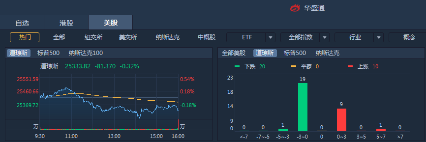 周三美股涨跌不一,苹果创新高提振科技股,中概股多数下跌。三大指数涨跌各异,道指收跌0.32%,标普下跌0.10%,纳指上涨0.38%。