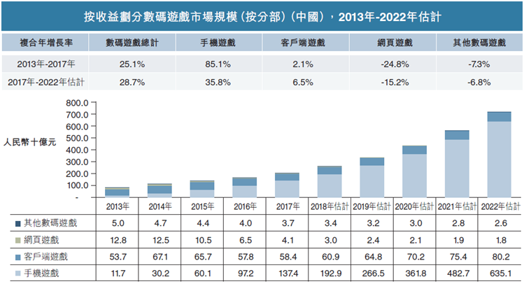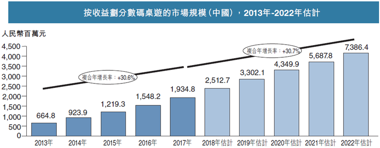 随着计算机及互联网技术的进步,部分数码游戏已开发成复制原桌面游戏。其中,2013-2017年市场规模年复合增长率达到30.6%,预计2017-2022年增长势头将获得持续,年复合增长率为30.7%。