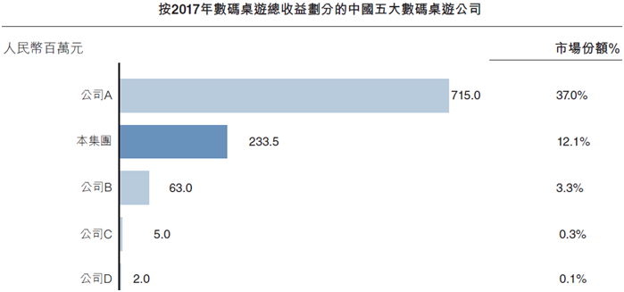 我国数码游戏市场高度集中,由腾讯和网易发行、分销的数码游戏约占总体市场份额的70%,导致其他公司通常选择海外分销或更为细分的市场垂直运营。按照2017年数码桌游收入计算,公司在我国数码桌游市场份额为12.1%,仅次于网易的37%,排名第二。