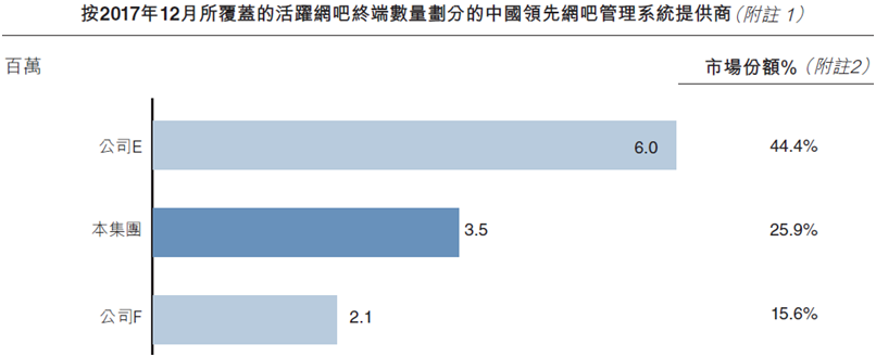 2017年12月,我国活跃网吧终端总数为1350万,行业排名第一其覆盖量为600万,市场份额为44.4%。公司覆盖量为350万,市场份额达25.9%,自2015年进入市场的后来者,实现惊人扩张,快速超越自2006年就开始进入网吧营运市场的公司F,在中国所有网吧业务管理系统供应商中排名第二。