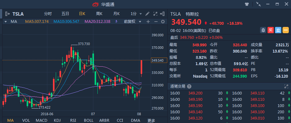 特斯拉周三盘后发布了Q2财报,因多项指标超预期,周四大涨16.19%至349.54美元,单日令空头损失11亿美元。