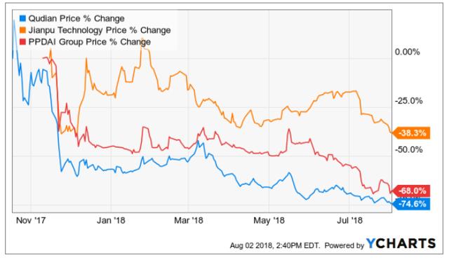 中国对新兴产业的严密监管,具有在短时间颠覆一个行业的强大力量。例如,去年政府对金融科技贷款机构突然加强监管,这导致该领域的增长出现停滞,一些新上市的公司元气大伤。如下图所示,趣店、拍拍贷和简普分别暴跌74.6%,68.0%和38.3%。