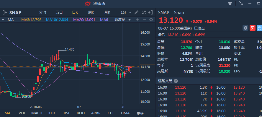 Snapchat母公司Snap(SNAP)昨日盘后发布了截至6月30日止的18财年Q2财报,营收及净亏损好于市场预期,昨日股票收涨0.54%,盘后股价波动较大,盘中有消息称沙特王子Alwaleed买入公司2.3%的股份,股价从一度大跌11%至涨近10%,最终收盘微涨0.69%。