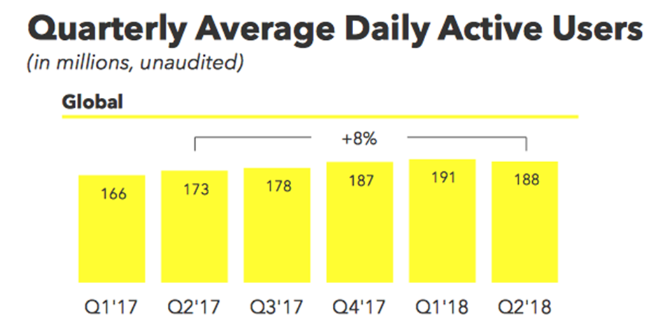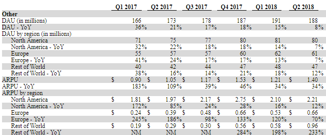 在此前facebook和推特业绩不佳的阴影下,用户活跃度成为市场的重点关注指标。公司Q2用户数据同样低于预期,季度日活用户1.88亿,同比增长8%,不过低于市场预期1.93亿,较一季度1.91亿下跌2%, 为近年来首次下滑,CEO表示月活数量仍有上升的,但财报并未具体披露数,另外可喜的是每用户平均收入(ARPU)同比增长34%至1.40美元。