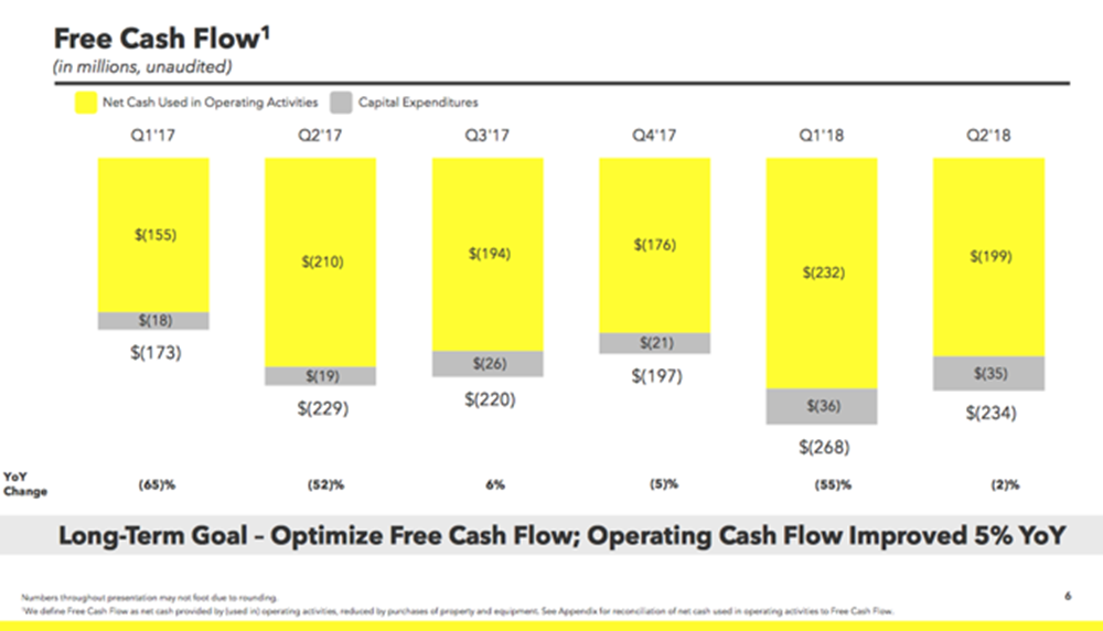 为驱动增长,公司持续对群聊 、AR自拍游戏Snappables及智能眼镜Spectacles进行大量投入及优化更新,不过并未带来用户增长及烧钱改善。运营现金流从季末自由现金流为负2.34亿美元,相比去年同期的2.29亿美元持续恶化,现金余额从17年底的超过20.4亿美元下滑至15.7亿美元,按每季度烧钱超2亿的速度,预计到明年将可能低于10亿美元,并随后带来再融资需求。