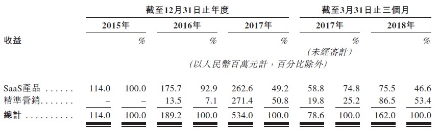 平台通过“去中心化”的解决方案颠覆传统电商模式,通过SaaS产品,中小企业可以自主联系和管理客户,商家掌握销售的主导权。2017年10月新推出的PaaS平台增加了更多更好的应用工具,针对不同商家不同行业进行量身定制,更好地为商家服务。截至2018年3月31日,SaaS产品和精准营销拥有260万注册商户,而截至2017年12月31日的SaaS付费商户仅51494名,精准营销的广告主数量仅17681名,目前仍存庞大的潜在用户群和获利空间。