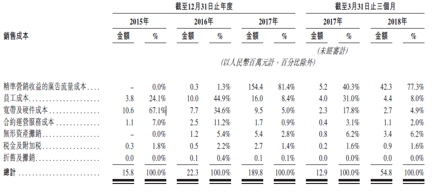 自2016年发展精准营销业务以来,精准营销收入占比不断增加,2017年占总收入比率达50.8%,而2018第一季度占比进一步增长,达53.4%,在公司业务中的重要性越来越大。同时,精准营销所用成本也不断增加,占比不断提高,2016年总成本主要包括员工成本和宽带及硬件成本,而精准营销成本仅占1.3%,而2017年精准营销成本占比猛增至81.4%,这一部分成本主要来源于购买与精准营销受益相关的广告流量而按照总额基准向发布商支付的媒体费用,根据当期确认的精准营销受益来确认相应成本。