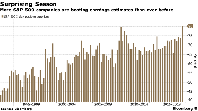 彭博调查显示,相比以前,越来越多的S&P 500公司业绩超预期,频率可以说与日俱增。