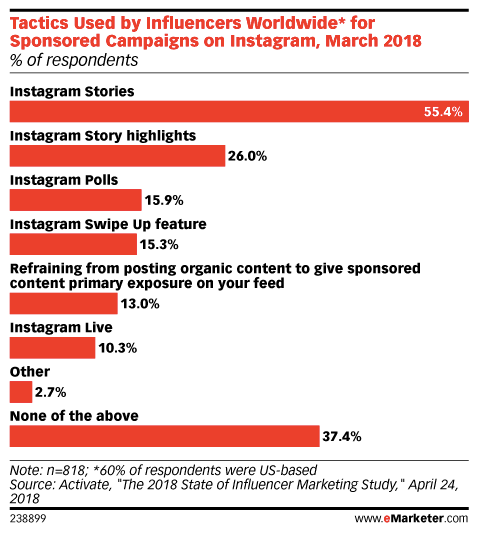 看到一个有意思的调查:2018年2月由意见领袖营销机构Activate进行的一项调查显示,全球88.9%的意见领袖表示他们在Instagram进行的意见领袖营销活动比一年前更多了。除了Feed上的帖子,Instagram Stories是赞助广告最常用的。