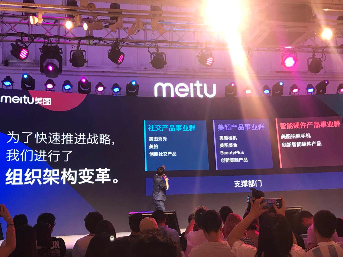 具体来说就是除了美图秀秀和美拍外,其他App产品划归在美颜产品事业群;智能硬件产品事业群是手机和其他智能产品;最重点的社交产品事业群,探索由工具到社区再到社交的转型,直接由吴欣鸿和程昱共同负责。