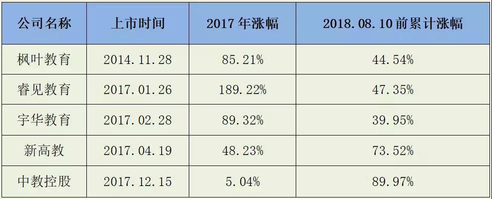 其中,枫叶教育、睿见教育、宇华教育、新高教在2017年都有强势表现,并且延续到今日之前。