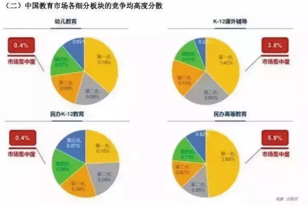 而且从市场的集中度看,不论幼教、K12课外辅导、民办高等教育,市场的集中度都比较低,竞争高度分散,属于典型的大行业、小公司的特征,未来市场增长前景广阔。