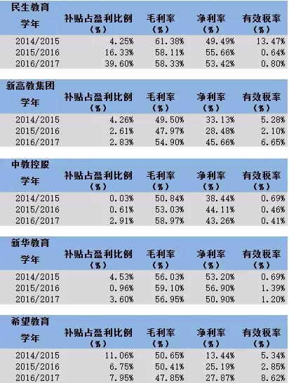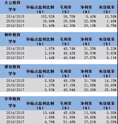 数据显示,2016/2017学校除了睿见教育(6068.HK)外,现阶段市场部分高度关注的公司都享有极低的税率,其中天立教育(1773.HK)在基本免税的同时,还享有高额补贴。