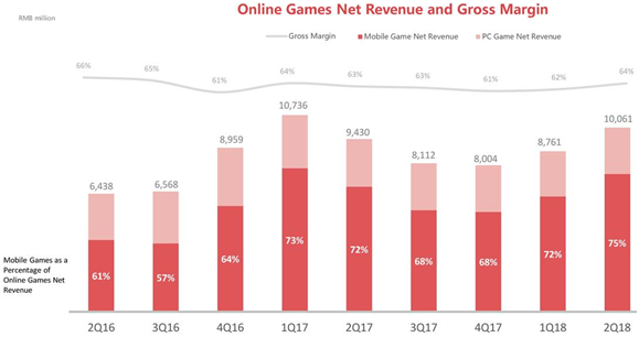 但是作为公司最大收入来源的游戏业务,因为其付费方式与公司递延收入相关性强,而公司本季度递延收入增长缓慢,相比于2017年年底的62.38亿元,增长为2018年年中的63.55亿元。通过下图则可明显看出,公司的递延收入在进入2017年之后开始有见顶征兆。