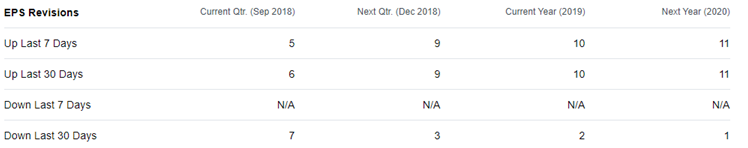 同时,玩家们翘首以待的《荒野大镖客:救赎2》也将在10月开始发售,作为由《GTA5》以及前作《荒野大镖客》团队操刀制作的最新作品,早在前两年开发之际就开始备受关注。由于玩家反映强烈,以至于许多同行公司为了避免与之撞车,纷纷更改原定的作品发布时间。资本市场上,分析师们也对公司变现出极高热情,2019财年的EPS修正预期持续上调。