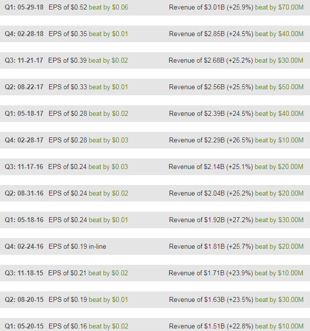 公司业绩稳定增长,并持续超出市场预期,如下表,唯一的一次例外是16Q4 EPS符合预期,另外近几个季度营收超出预期的幅度变大,最近的19Q1营收达到30.1亿美元,比市场一致预期高出7000万,为多年新高,而且EPS比预期高出0.06美元,是前几年的两到三倍。
