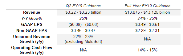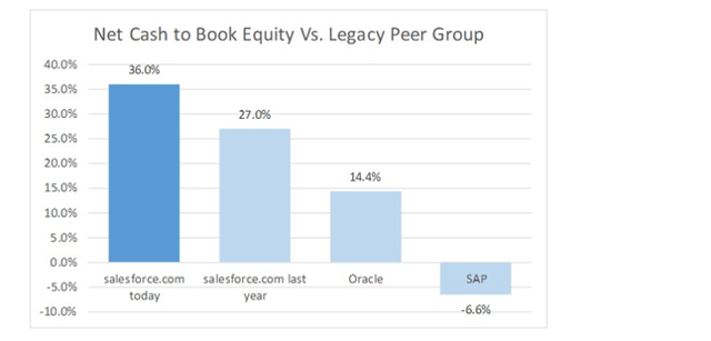因SaaS订阅带来的不同收入模式,一方面有利于公司营收增长及利润率的稳定,预收收入(unearned revenue) Q1末达到62亿美元,同比增速高达25%;另一方面现金流大幅改善,有利于支持战略性并购或投资,比如此前65亿美元收购MuleSoft,6月宣布未来五年将在英国投资近25亿美元。季末累积的现金、现金等价物及可售证券为71.6亿美元,还比较充裕。运营现金流预计同比增速在14%左右,净现金与权益账面价值比例远高于传统的软件同公司。
