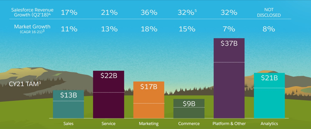 根据Garter的报告,公司在多个细分领域的营收增速明显于行业复合增速,比如销售云及服务云增速高出近6至8个点,而营销云、商业云、平台及其他业务增速高出一倍。在销售云预期市占达到40%以上,未来可能增速放缓的情况下,营销云、商业云市占还不到20%,有充裕增长空间供挖掘,体现出增长领域多元化业务对营收稳定增长的作用。