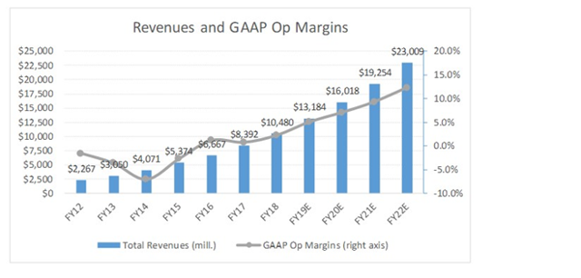 不仅如此,公司多次上调业绩展望,19Q1营收同比增长25%后,预计下季及全年维持同样的增速水平,高营收基数下仍能维持这样的速度令人满意,公司2022年的年营收中位目标是210亿美元,相当于四年复合增速17%。