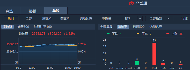 美国股市高开高走全线收涨,道指涨1.58%,报25558.73;标普500指数涨0.79%,报2840.69;纳指涨0.42%,报7806.52。