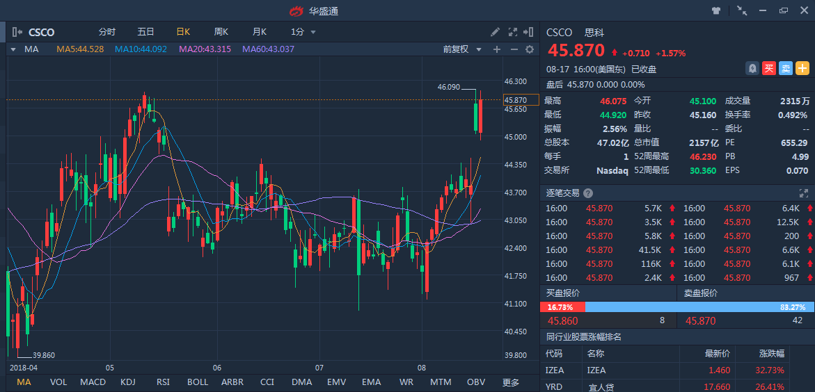 思科(CSCO)上周三盘后发布18财年Q4业绩,表现超出市场预期,当日盘后一度大涨7%,随后两个交易日涨近4.5%,强劲增长的Q4是18财年不错的收尾,提振了市场情绪。