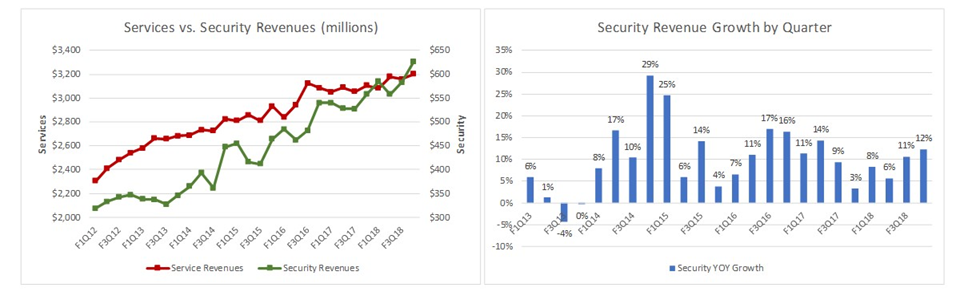 安全业务加速增至6.27亿美元,高于分析师此前预测的6.158亿美元,一年半之后又恢复到12%的同比高增速,高于所在市场7%左右的复合年增速,同时市占获得提升,对手Check Point (CHKP)营收增长仅为2%;管理层预计未来将维持高增长,尤其是对互联网安全公司Duo Security的收购将于19财年Q1生效,成为未来一大驱动。